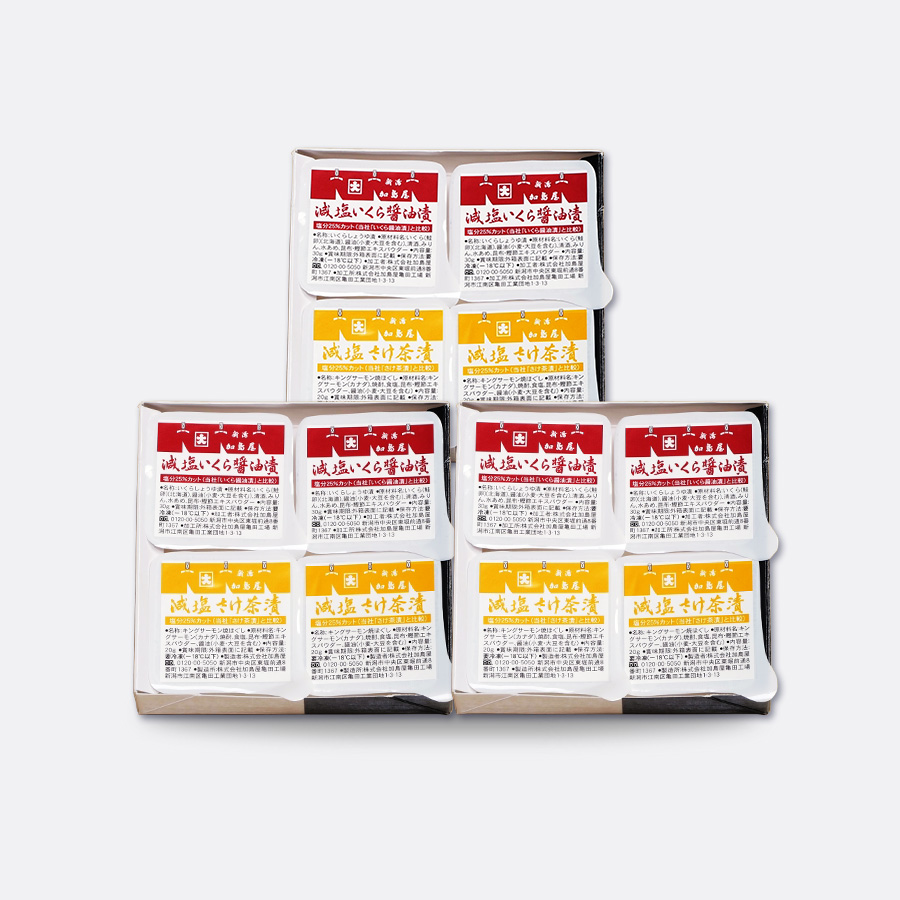 内容量 : 減塩さけ茶漬・いくら醤油漬セット×3※ 1函内訳・減塩 さけ茶漬 20g×2・減塩 いくら醤油漬 30g×2