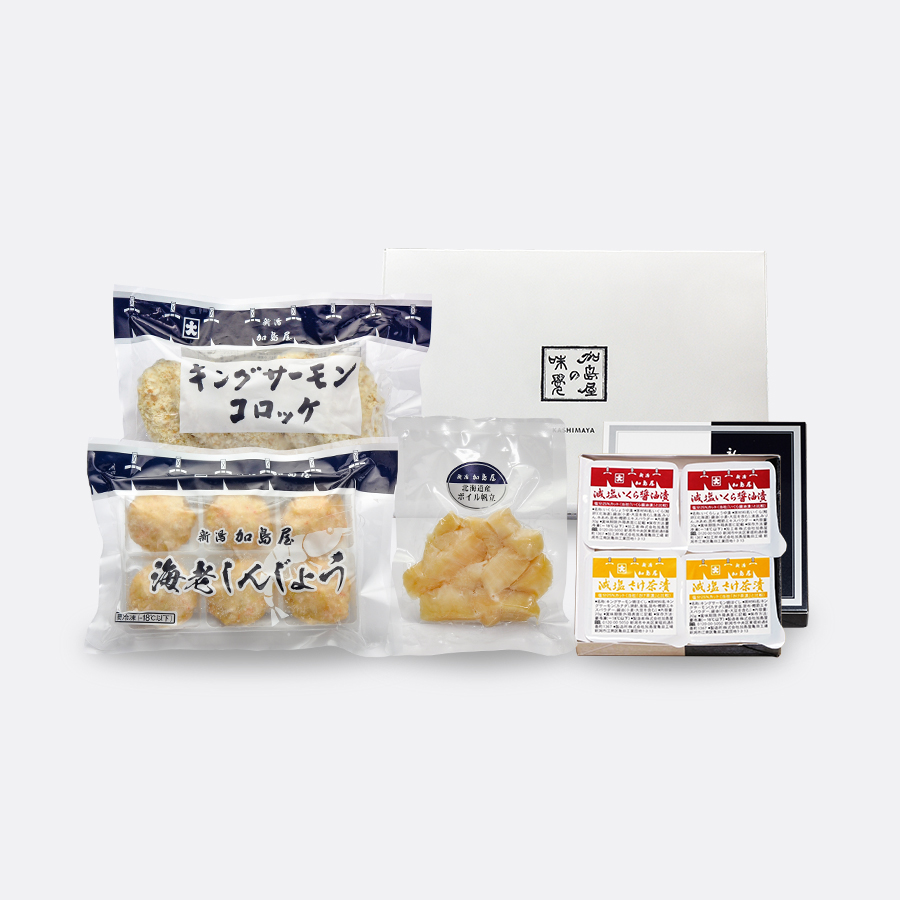 内容量 : 減塩さけ茶漬・いくら醤油漬セット × 1 北海道産ボイル帆立 × 1 冷凍加島屋の海老しんじょう6個入 × 1 冷凍キングサーモンコロッケ5個入 × 1