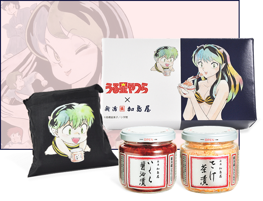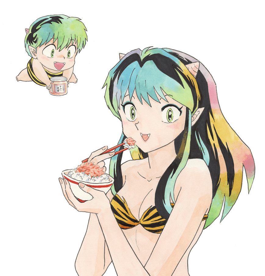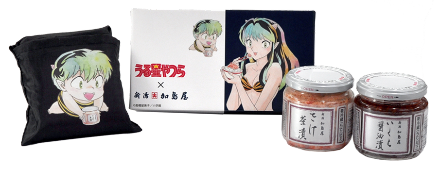 加島屋のはっぴ姿のラムちゃん、さけ茶漬をもったテンちゃん、さけ茶漬を食べているラムちゃんの3種類の描き下ろしイラストが完成しました!