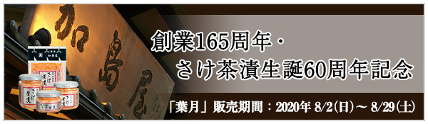 ご好評により、またまた「ご飯がすすむセット」が再登場! 販売されてから今年で60年「ご飯のお供」として皆様より ご好評いただいている加島屋の看板商品 「さけ茶漬」の中瓶2本を 期間限定・送料無料 でご用意しました。 販売期間:2020年 8/9(日)〜 8/29(土)17:00まで