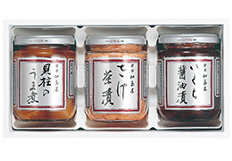 しっとりとした旨味とまろやかな味わいの加島屋の看板商品「さけ茶漬」大ビンと、北海道沿岸で漁獲される秋鮭の卵を丁寧にほぐして仕上げた、プチプチッと弾ける食感と濃厚な旨味がたまらない「いくら醤油漬」の小ビンを詰め合わせでご用意しました。