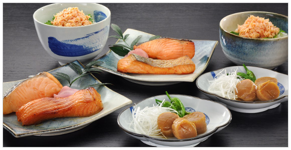 人気商品「さけ茶漬・貝柱のうま煮」の中ビン、脂の乗ったキングサーモンを手塩にかけて漬け込んだ「キングサーモン塩漬切身パック」越後味噌に漬け込み香味豊かに仕上げた「キングサーモン味噌漬切身パック」を詰め合わせました。