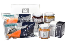看板商品「さけ茶漬」濃厚な旨味とコクが口に広がる「いくら醤油漬」キングサーモンの中骨を昆布で巻いてじっくり煮込んだ新潟の郷土料理「鮭の昆布巻」小鉢の一品におすすめの「鱈の親子漬」「切干漬」のセットです。